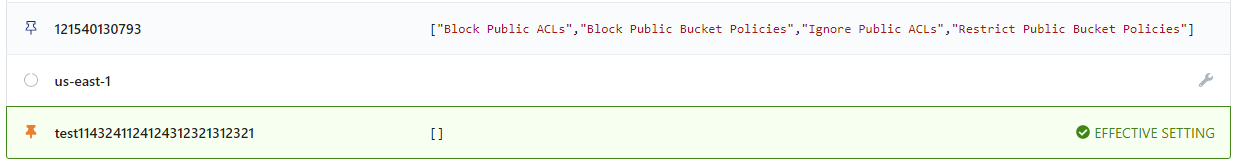 AWS > S3 > Bucket > Approvedwill have a corresponding Policy Value forAWS > S3 > Bucket > Approved. The policy value represents the effective setting for this instance, which may have been inherited from the AWS account, region, or set directly on the individual bucket.