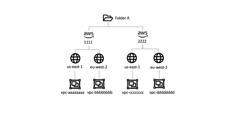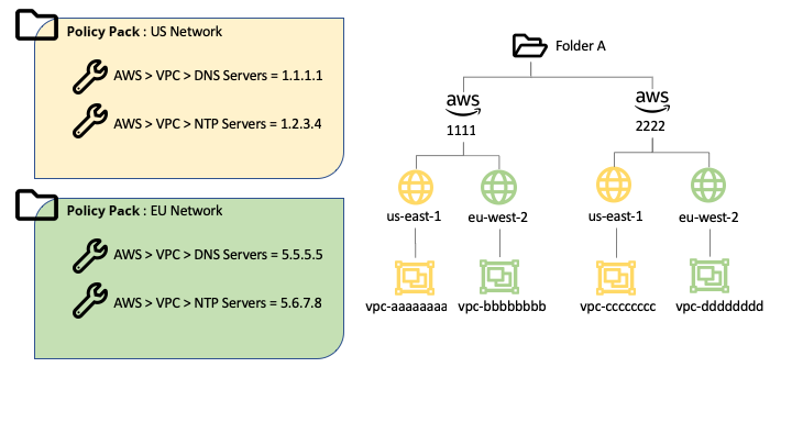 But consider a situation where we wish to have specific policy settings for VPCs based on their region (e.g. local DNS servers). VPCs are based in different accounts, so they exist in different branches of the hierarchy: