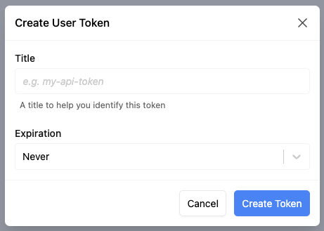 Click New Token to create a new API token. You will be prompted to enter an optional Title and select an Expiration date for the token. The expiration can be set to a specific duration or to Never, which means the token will not expire.