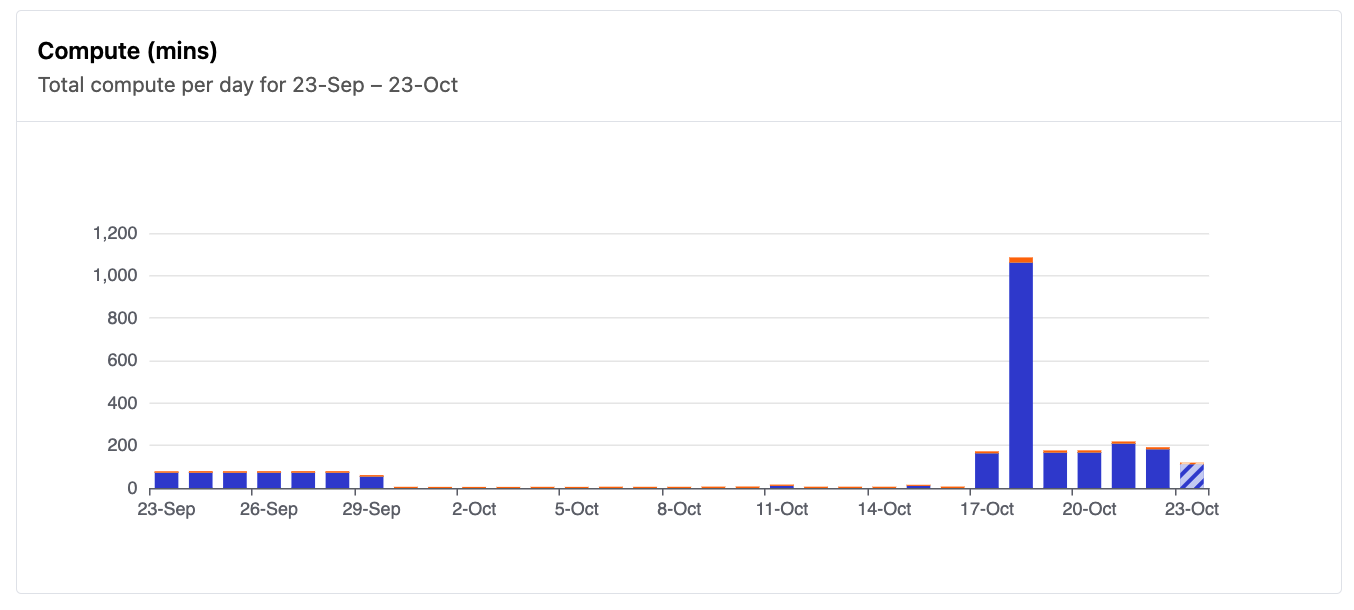 The Compute (mins) chart shows you your cumulative compute usage as well as your compute usage for each day in the specified date range, broken down by type:
