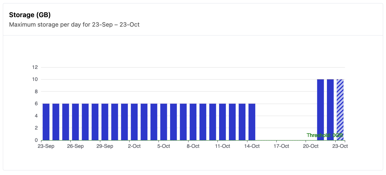 Charts for the compute and storage usage dimension appear below. You can select the date range for these charts. By default, the Last 30 days is shown, but you may instead select a different date range. The dashed line on each chart represents the included capacity for that metric in your plan. Hover over any bar in a chart to see the usage breakdown for that day.