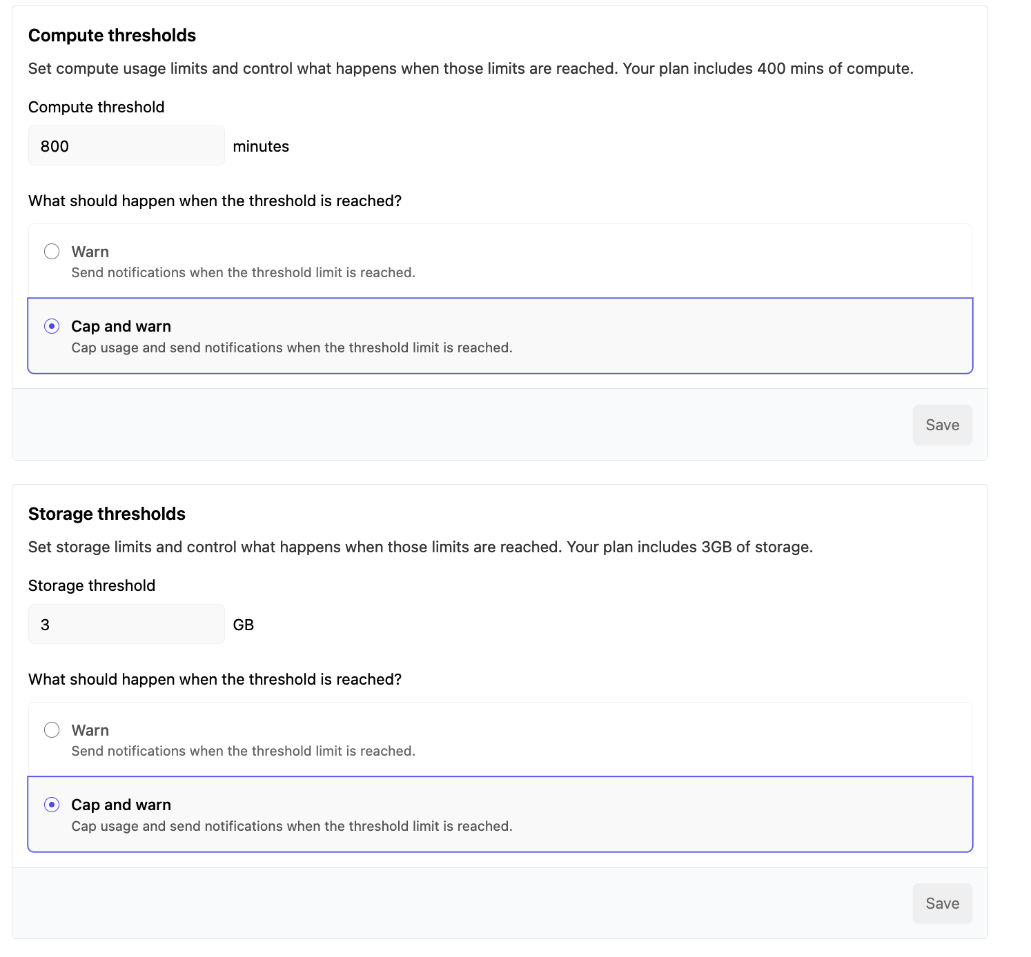 - Cap and warn - Cap usage and send notifications when the threshold limit is reached.