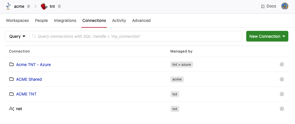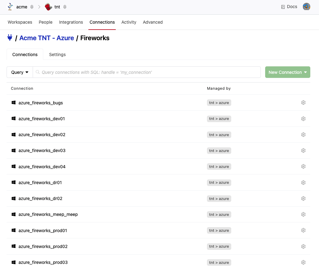 You can create connections and folders manually, but they may also be created by integrations. For example, the AWS, Azure, and GCP integrations create and manage folders and connections automatically to mirror the organizational structure of your cloud provider. You can manage permissions to share these connections and folders just like the ones you create manually, but note that folders that are created by integrations are only managed by the integration; you cannot add or remove sub-folders or connections from them.