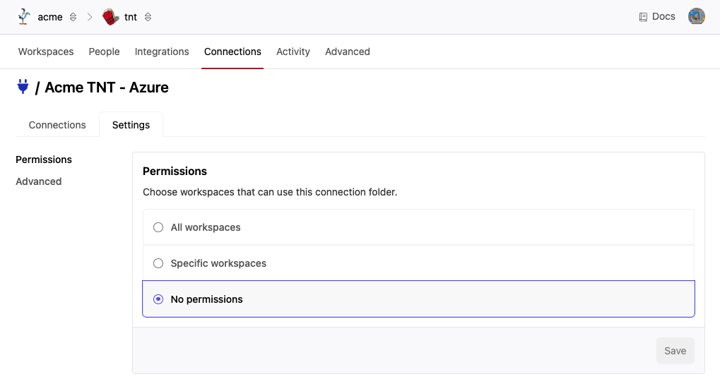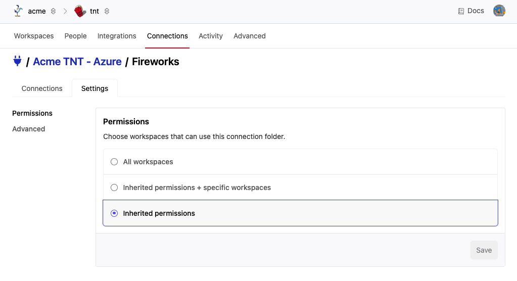 You can make connections available to workspaces by setting permissions, either on individual connections or folders. When you grant permissions on a folder, all the folders and connections that are members of that folder inherit the same permissions; granting access to a folder implicitly grants access to its sub-folders and connections. Note that permissions are additive and can only be granted, not denied. If you grant permissions to a workspace for a folder you cannot revoke access for these individual connections, only to the folder as a whole.