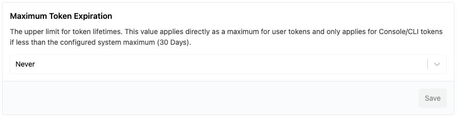 You can configure the maximum duration of tokens issued to users in your tenant. This setting applies to both temporary tokens issued via the console (browser) or CLI and user access tokens managed via their profile settings.