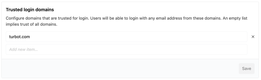 Trusted domains allow you to specify a list of email domains from which users can log in and be invited. The restrictions are applied regardless of the authentication method used.