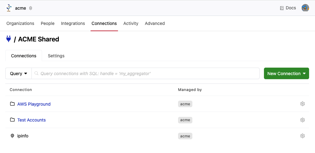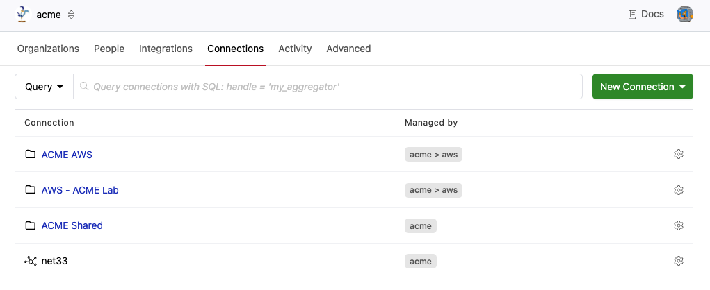 You can create connections and folders manually, but they may also be created by integrations. For example, the AWS, Azure, and GCP integrations create and manage folders and connections automatically to mirror the organizational structure of your cloud provider. You can manage permissions to share these connections and folders just like the ones you create manually, but note that folders that are created by integrations are only managed by the integration; you cannot add or remove sub-folders or connections from them.