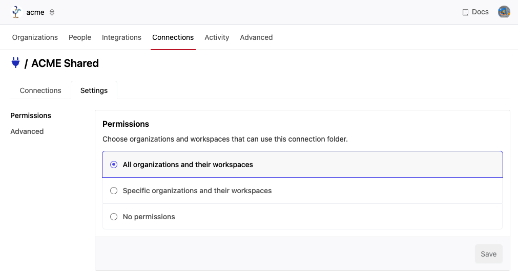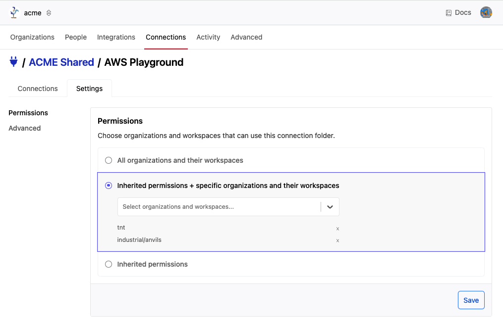 You can set permissions for folders and connections from their settings page. Navigate to the desired tenant or org and browse the Connections to find the resource you wish to manage. Click the gear icon for the connection or folder you would like to permission. From the Settings tab, select Permissions.