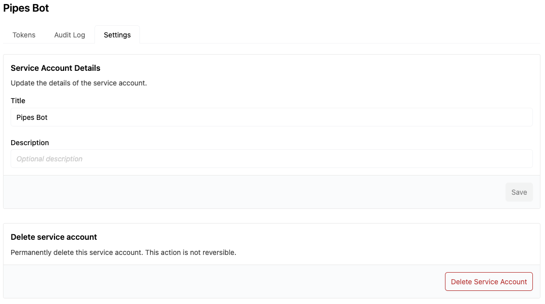 You may update the Title or Description of the service account. Click Save to apply your changes.