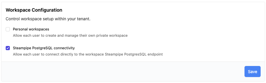 The Steampipe PostgreSQL connectivity checkbox allows you to enable or disable the ability for users to connect to the Steampipe PostgreSQL endpoint. Disabling this option will prevent users from connecting directly to the Steampipe PostgreSQL endpoint for all workspaces in the tenant. Additionally, all UI elements containing database endpoint connection information will be removed. New tenants have this option enabled by default.