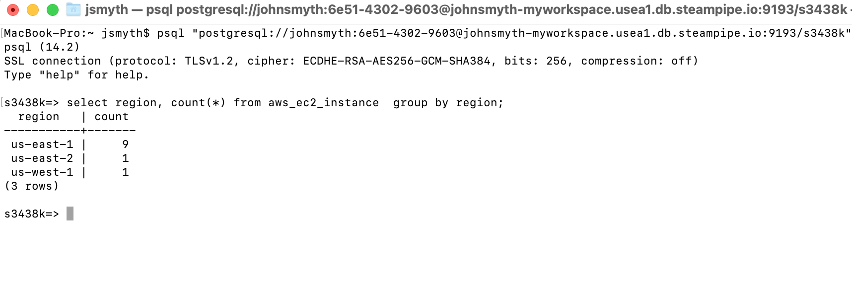 You can get the information needed to connect to your Turbot Pipes database instance from the Developers tab on the Steampipe page for your workspace. On the Developers tab, click Postgres CLI from the sidebar to show the psql command to connect to your workspace: