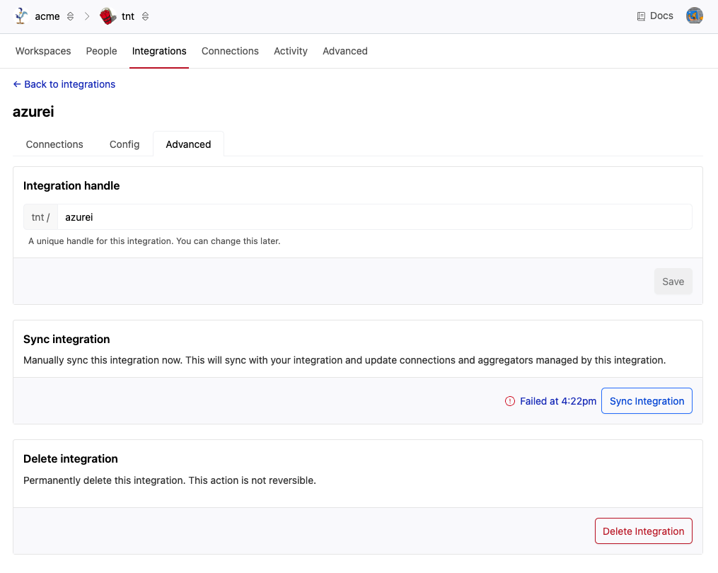 If you delete an integration, all of its associated folders and connections will be deleted and removed from all workspaces. This action is not reversible!