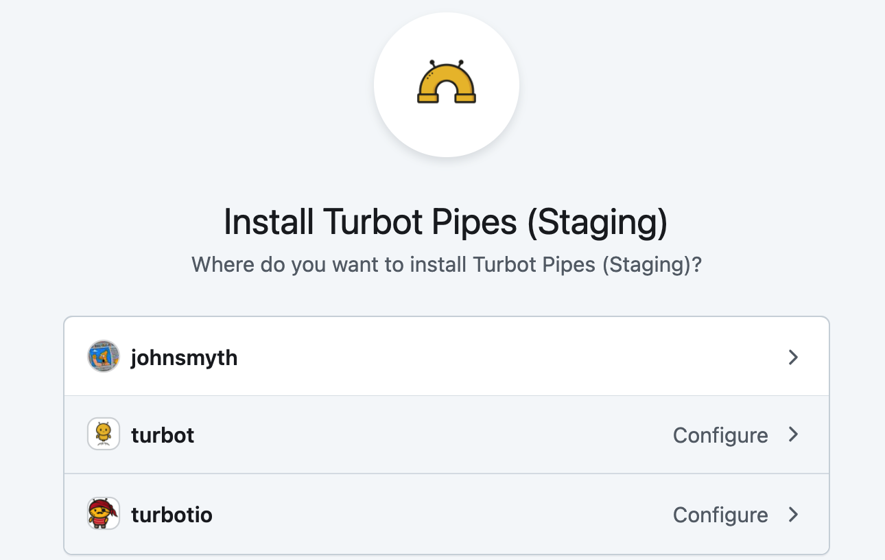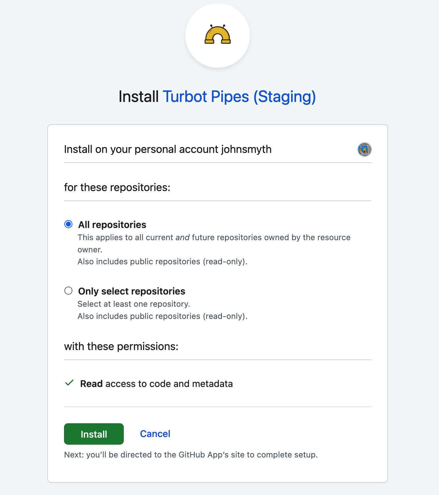 Select the GitHub user or organization that you would like to share with Turbot Pipes, then select which repositories to allow Pipes to access.