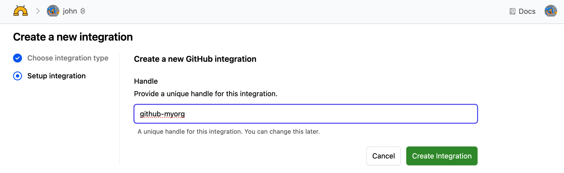 Enter a handle and click Create Integration. The integration is created, and you are redirected to the GitHub app installation screen.