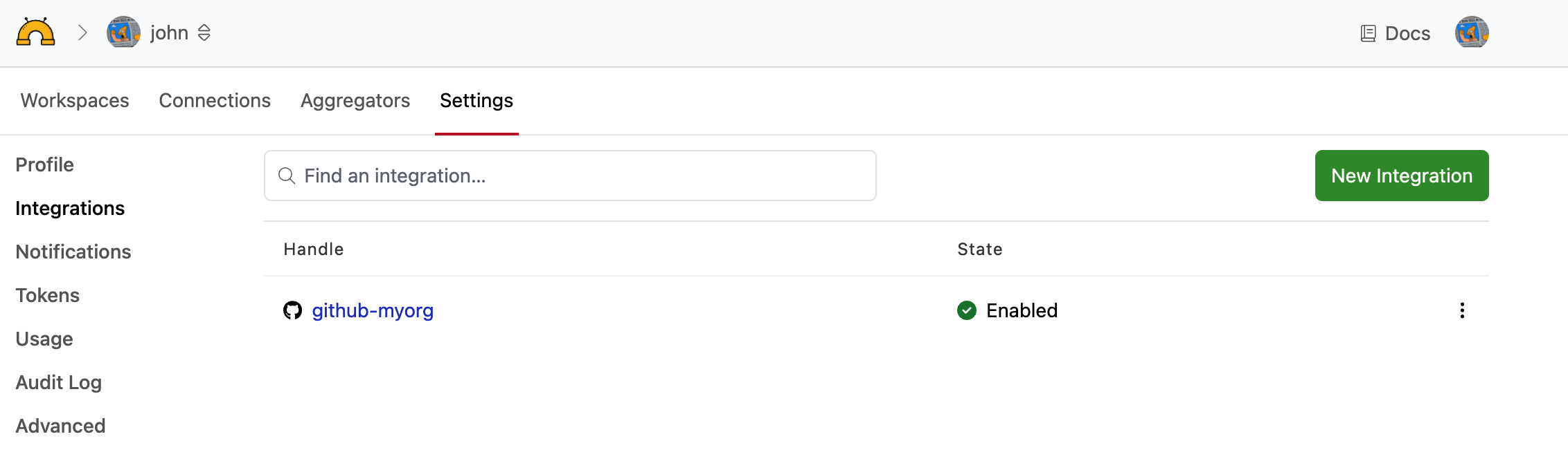 - To configure a Github integration for your Organization, click the double arrow button from the organization switcher at the top of the page and select the organization from the dropdown. Once you've selected your organization, go to the Integrations tab to manage the integrations for the organization.