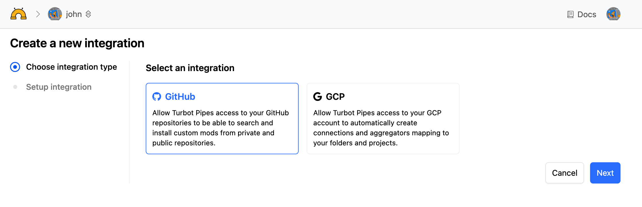 The GitHub Integration allows Turbot Pipes access to your GitHub repositories to be able to search and install custom mods from private and public repositories.
