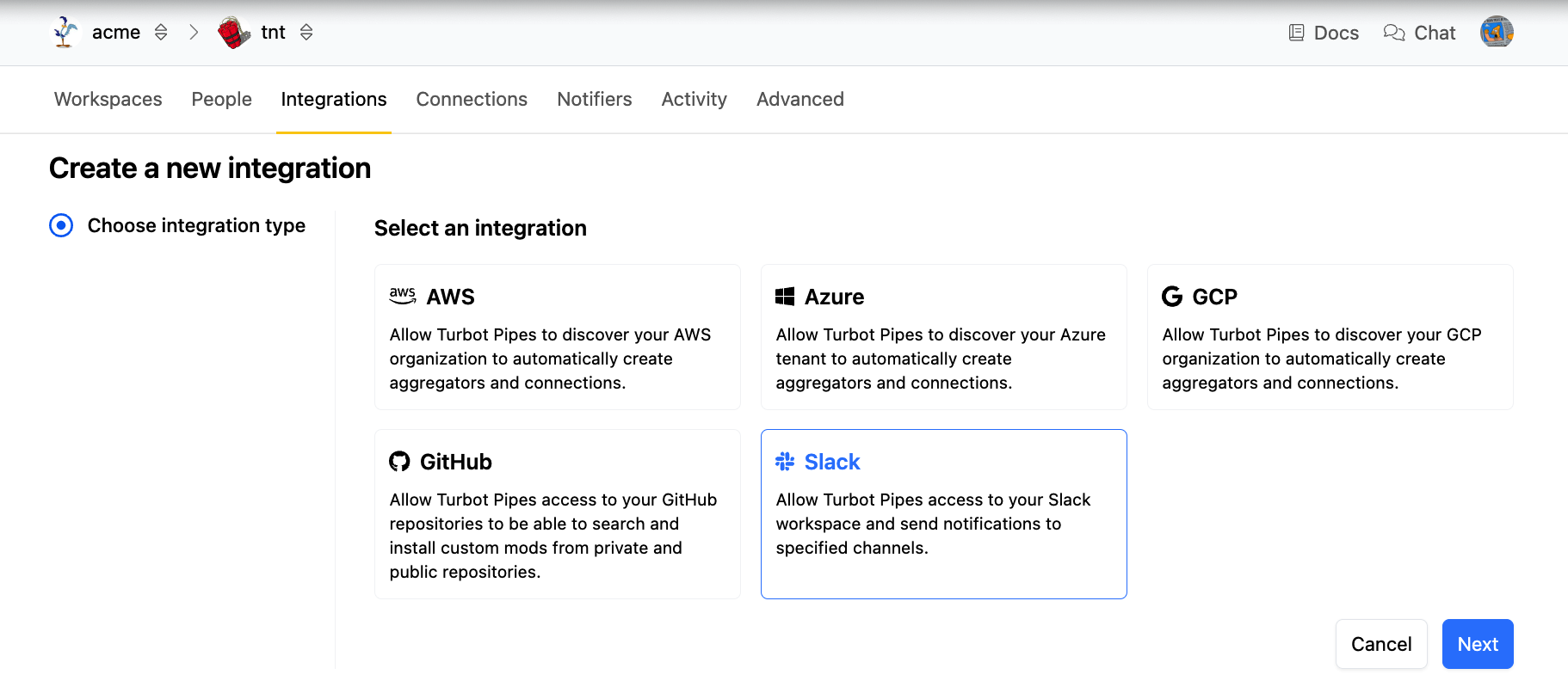 - To configure a Slack integration for your Tenant, click the double arrow button from the tenant switcher at the top of the Pipes console, select your tenant, and then select Tenant Settings. This option will only be visible in a custom tenant for which you are a tenant owner. Once you've selected your tenant, go to the Integrations tab to manage the integrations for the tenant.