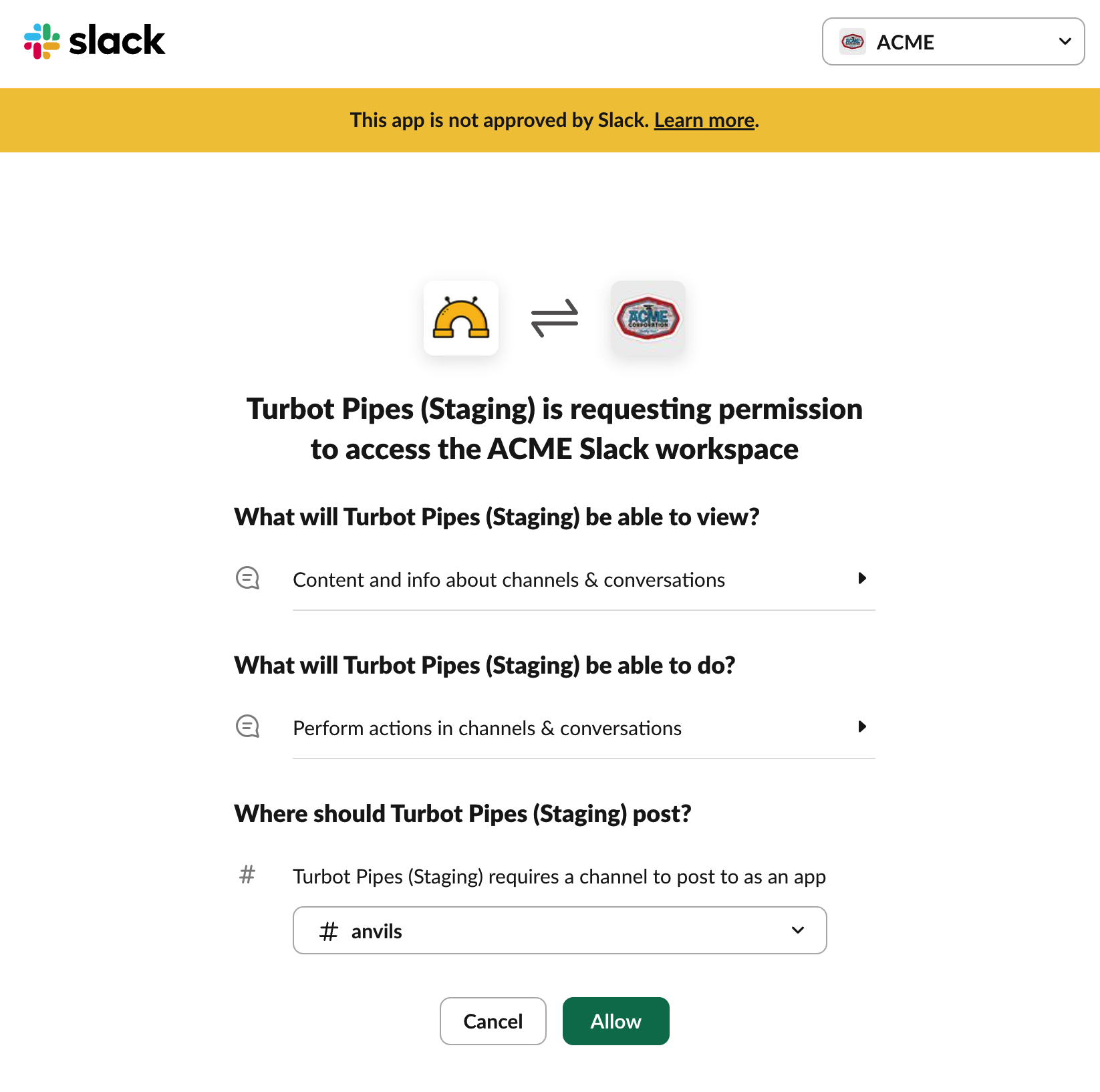 The Slack Integration allows Turbot Pipes to send notifications to specified Slack channels. Once the Slack integration has been configured, you can configure notifiers to send messages to your Slack workspace.