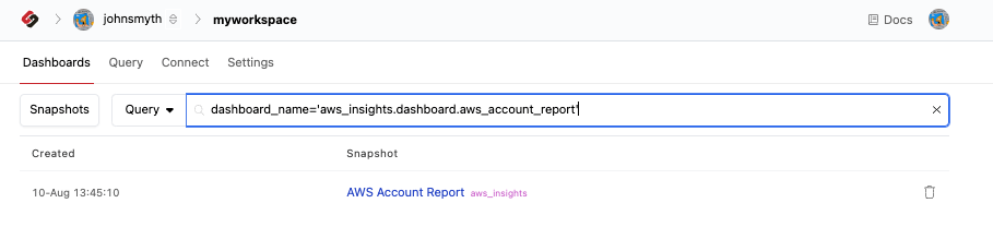 https://pipes.turbot.com/api/latest/user/johnsmyth/workspace/myworkspace/snapshot?where="dashboard_name='aws_insights.dashboard.aws_account_report'"