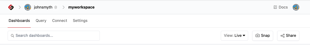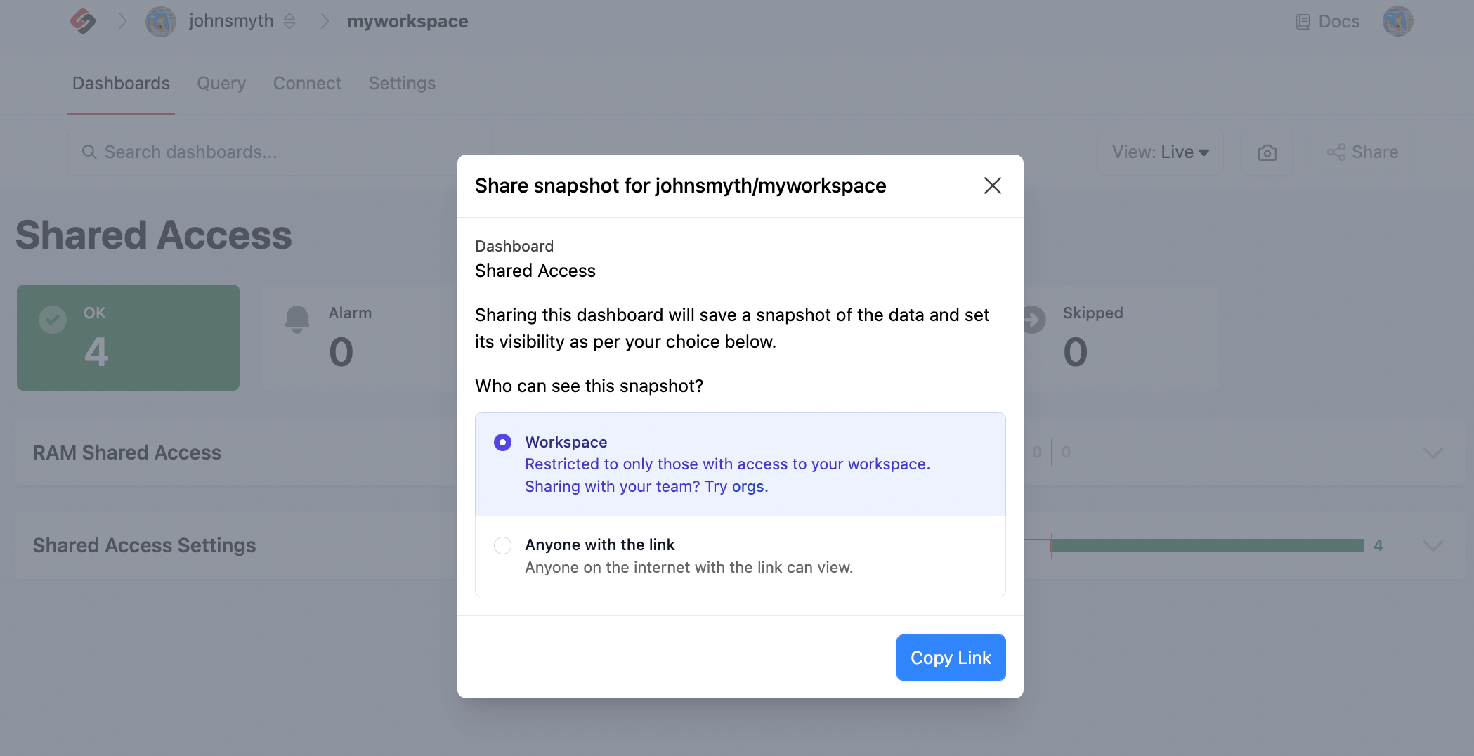 Alternatively, you can click the Share button to take a snapshot and share a link with others. You can set the visibility of the snapshot to restrict access to only those with access to your workspace, or share it so that anyone on the internet with the link can view it.