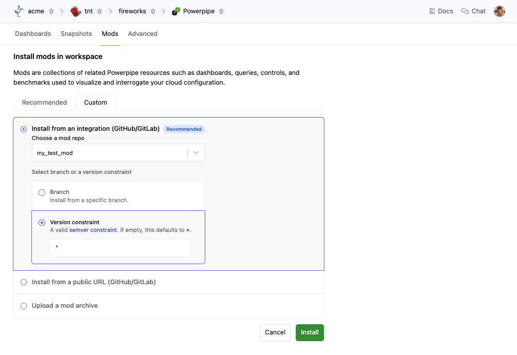 Rather than selecting an official mod within the install mods screen, you can choose to install a custom mod. If you have set up a GitHub Integration, this can be any mod that the Integration can access (including mods in private repos).