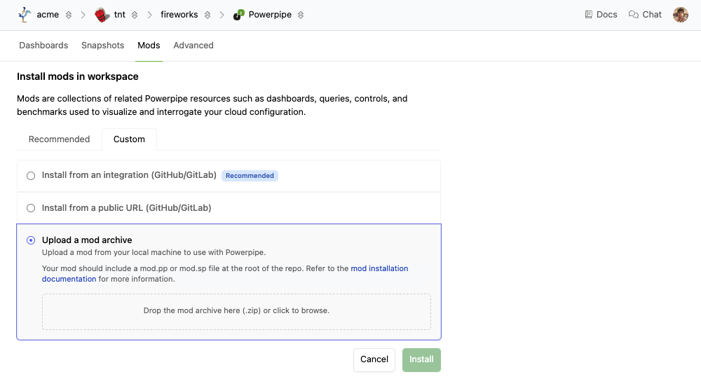 You can install custom mods from the Settings tab of your workspace. On the settings page, click Mods, then click the Install Mods button. From the mod installation page, click the Custom tab.