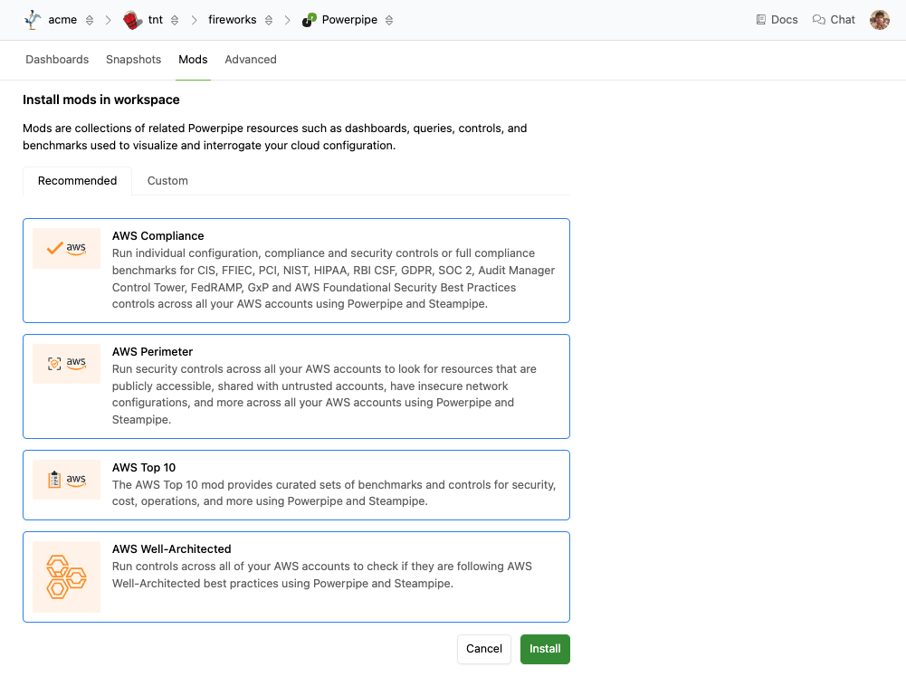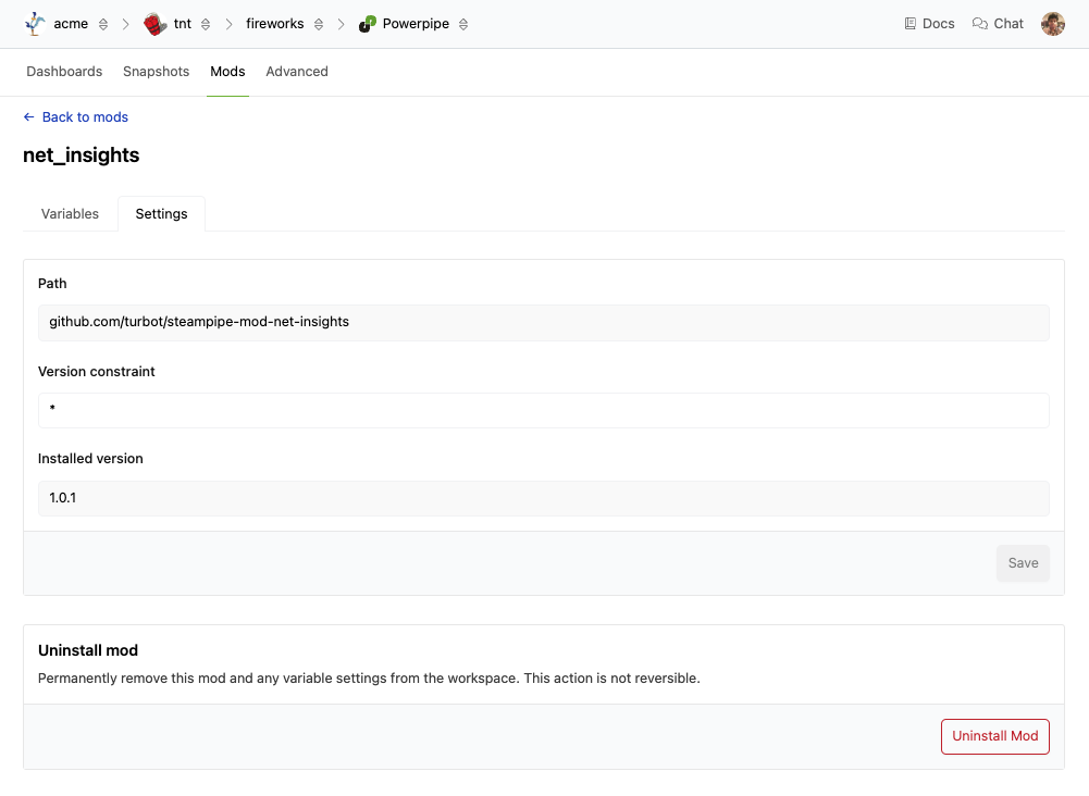 You can manage mods from the Mods tab for the Powerpipe service in your workspace.