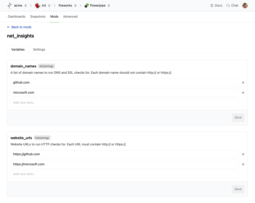 From the Powerpipe Mods tab, you can click the mod you wish to view/manage the variables for.