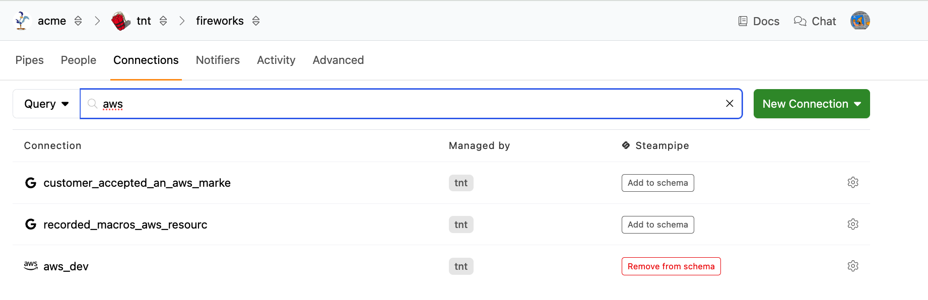 You can also create new connections for your workspace from the Connections tab. When creating a new connection, you can choose to Add to Steampipe schema automatically during creation to create the connection and add the schema in a single step.