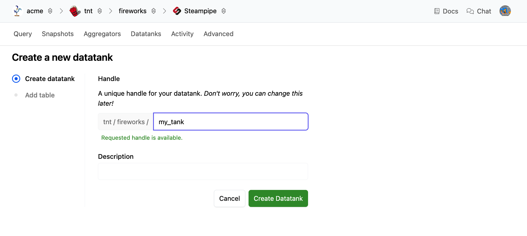 Enter a handle for your datatank. This handle will also be used as the Postgres schema name and must be unique among all schemas in the workspace. You may optionally enter a description as well. Click Create Datatank.