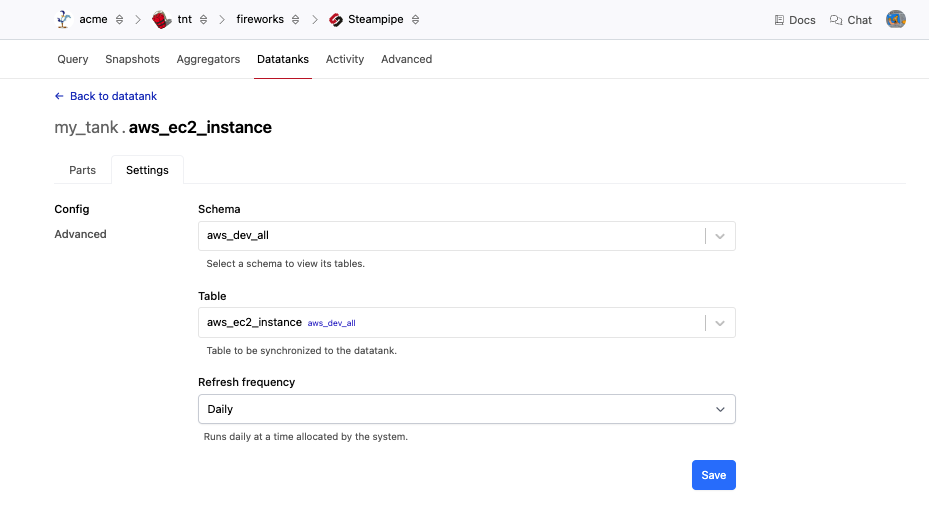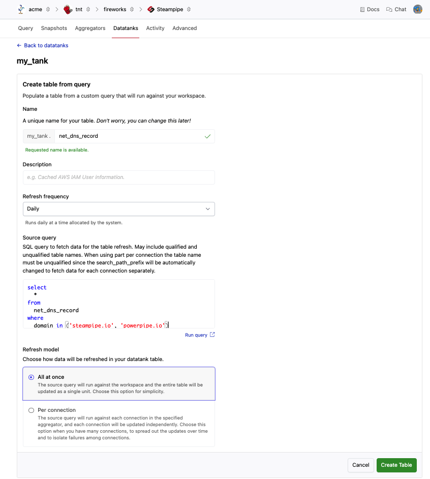 Datatank allows you to accelerate queries to Steampipe by periodically fetching data and storing it in a persistent database table. Most of the time, you'll want to add an existing table to the datatank as-is. By default, the datatank schemas precede the aggregators and connections in the schema search path. Adding a table to the datatank that is identical in name and structure to the existing table allows it to be used instead of the live schema when running dashboards, benchmarks, and unqualified queries.