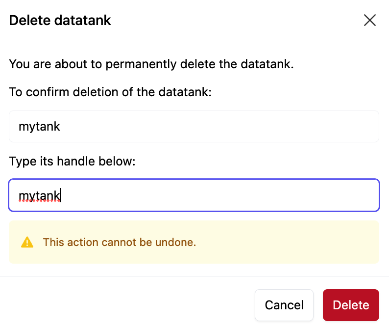 Click Delete Datatank. You will be prompted to confirm the deletion; enter the datatank name and click Delete. This action is not reversible.