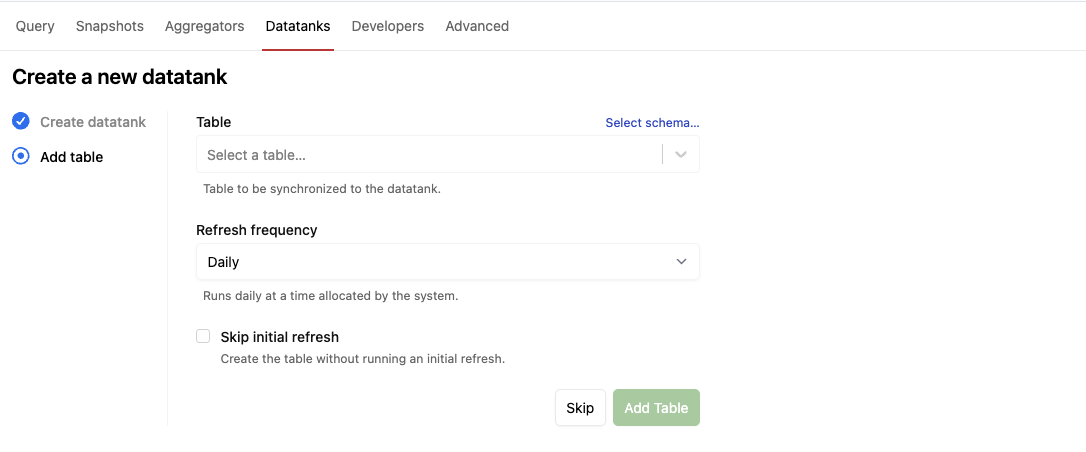 You can click Skip if you don't want to add any tables at this time; otherwise, choose a table to sync, the refresh frequency, and whether you want to skip the initial refresh, and then click Create Table.
