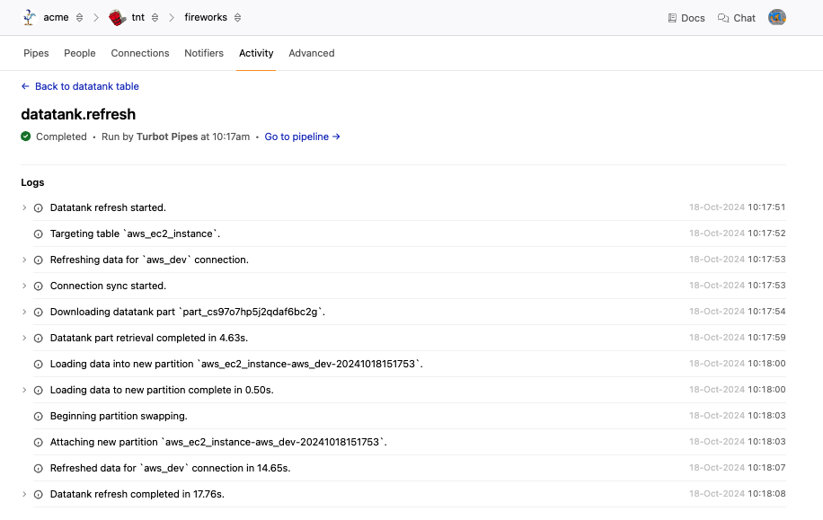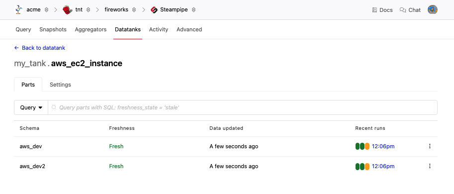 When a table is created, Pipes will kick off an initial pipeline refresh immediately, regardless of the schedule/interval, and data will begin syncing immediately. If your source schema is an aggregator, your datatank table will comprise multiple parts, one for each source connection. Each part will be refreshed atomically on its own schedule, and if connections are added or removed from the aggregator, the datatank parts will be added or removed automatically. The freshness graph shows the status of all parts of your table. You can view the status of the parts in detail by clicking on the table name or clicking an area on the freshness graph to see the parts filtered by their state.