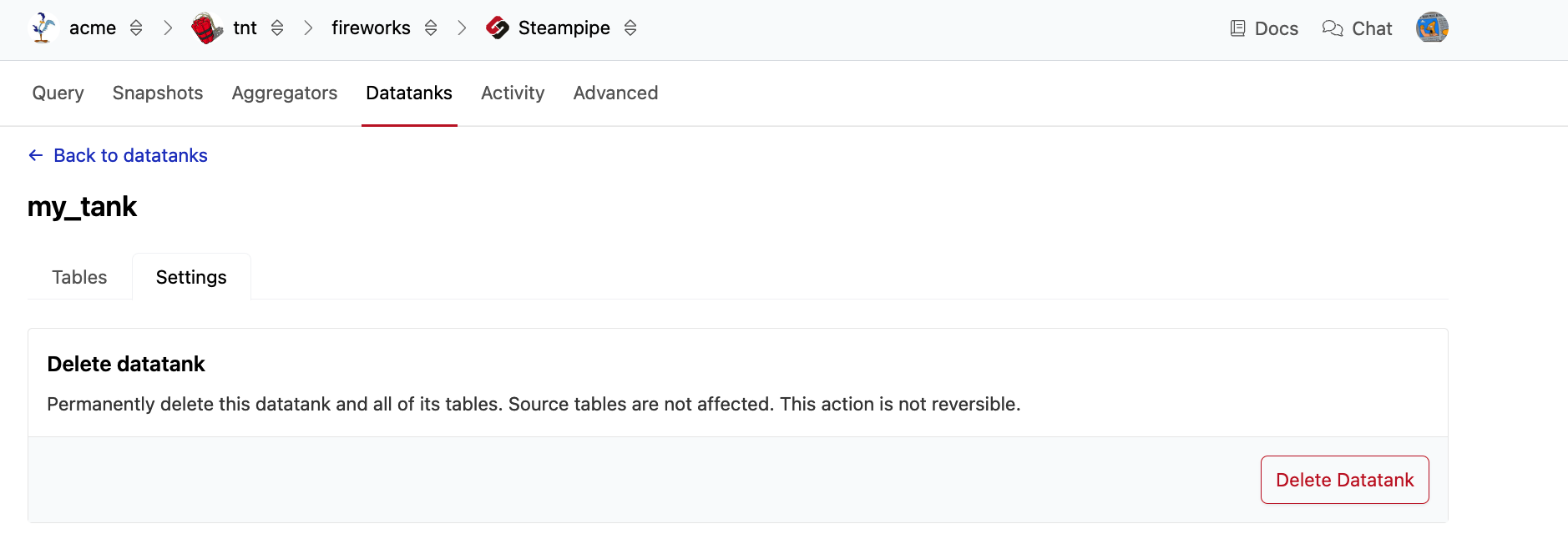 To delete the datatank, navigate to your workspace. From the Pipes tab, select Steampipe. Then go to the Datatanks tab. From the list of datatanks, click the gear icon next to the datatank that you wish to delete.