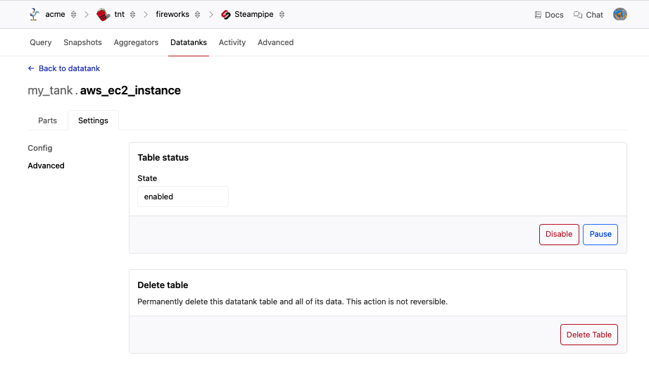 From the Steampipe Datatank page for your workspace, click the datatank to go to the datatank page. From this list of tables, click the table that you wish to delete, then click Settings to go to the table settings page. Click Advanced.