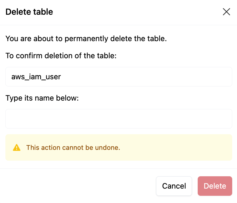 To permanently delete this datatank table and all of its data, click Delete Table. You will be prompted to confirm the deletion; enter the datatank name and click Delete. This action is not reversible.