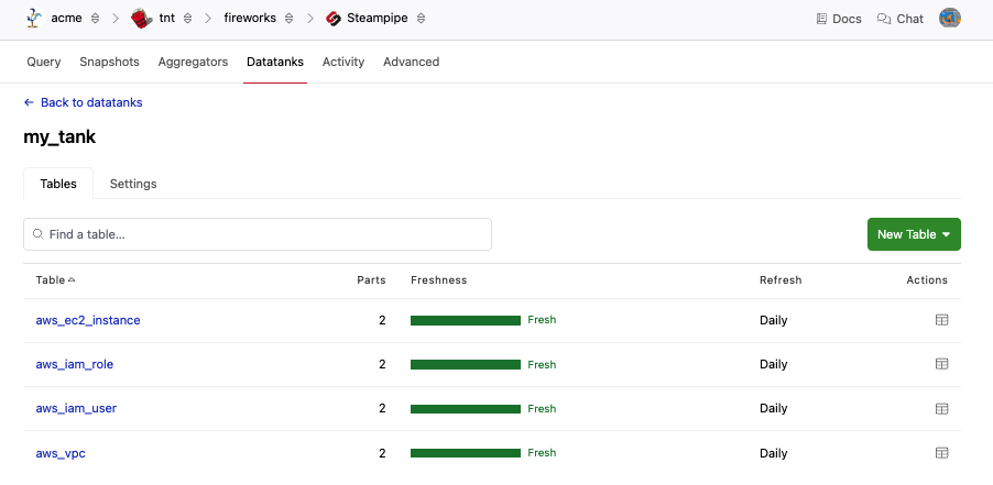 You can view the status of your tables from the datatank page. To get to the datatank page, navigate to the Pipes page for your workspace and select Steamipe, then go to the Datatanks tab. Click the Datatank you want to manage.