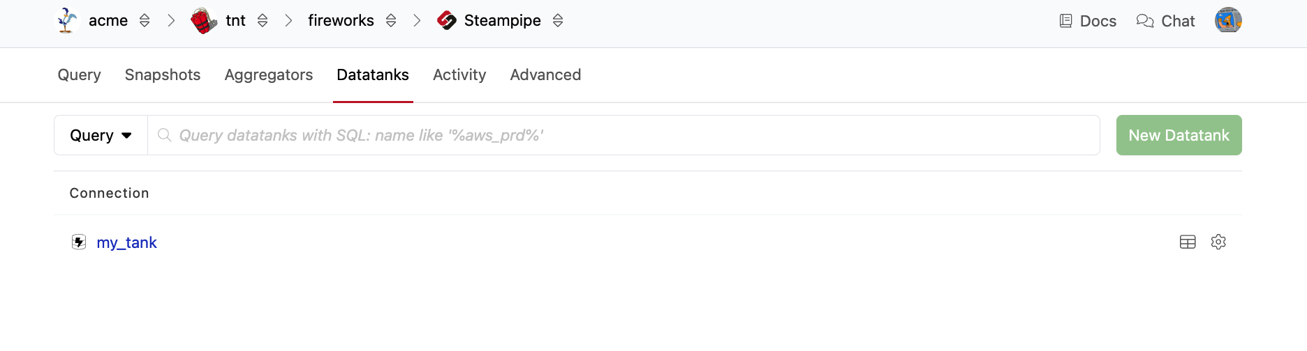 Datatanks are a type of workspace-level schema. To create one, navigate to your workspace. From the Pipes tab, select Steampipe. Then go to the Datatanks tab. Click the New Datatank button.