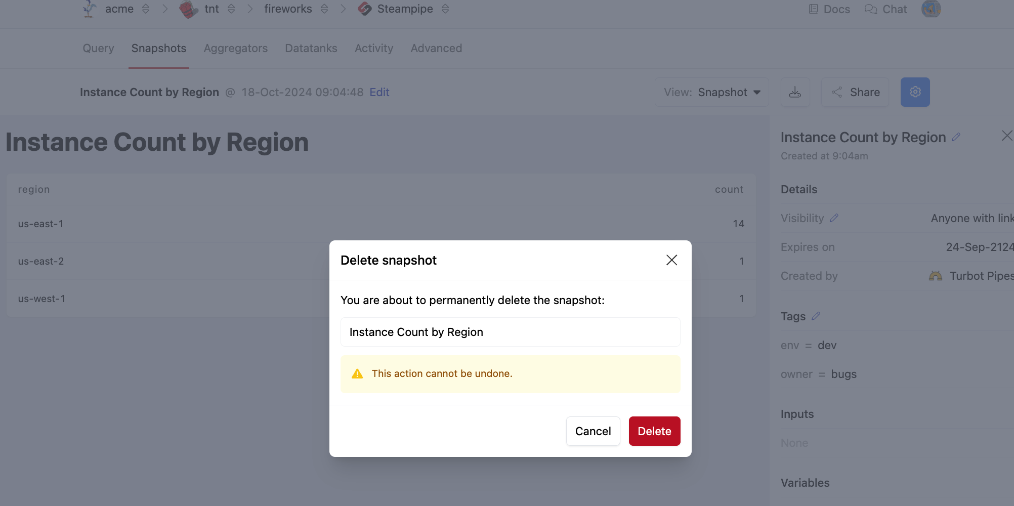 You can manage these snapshots from the Snapshots tab for the Steampipe service in your workspace.