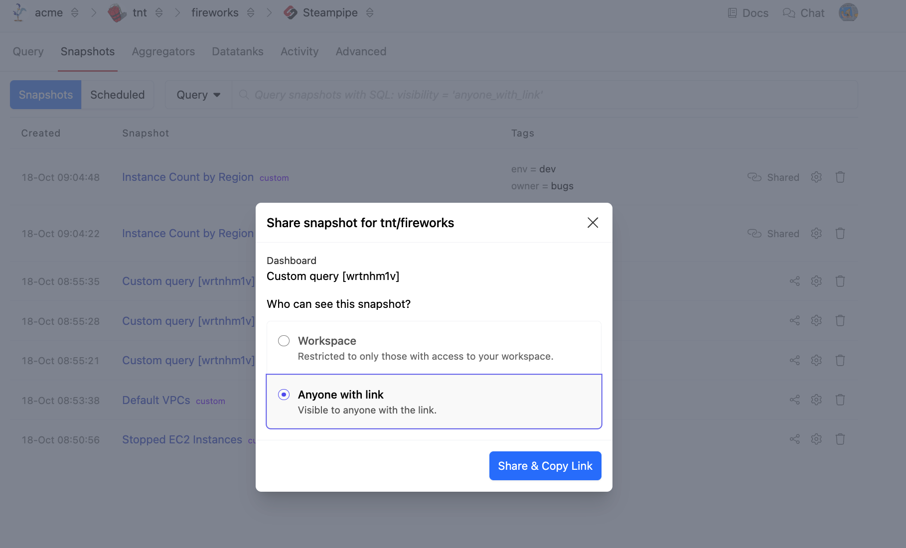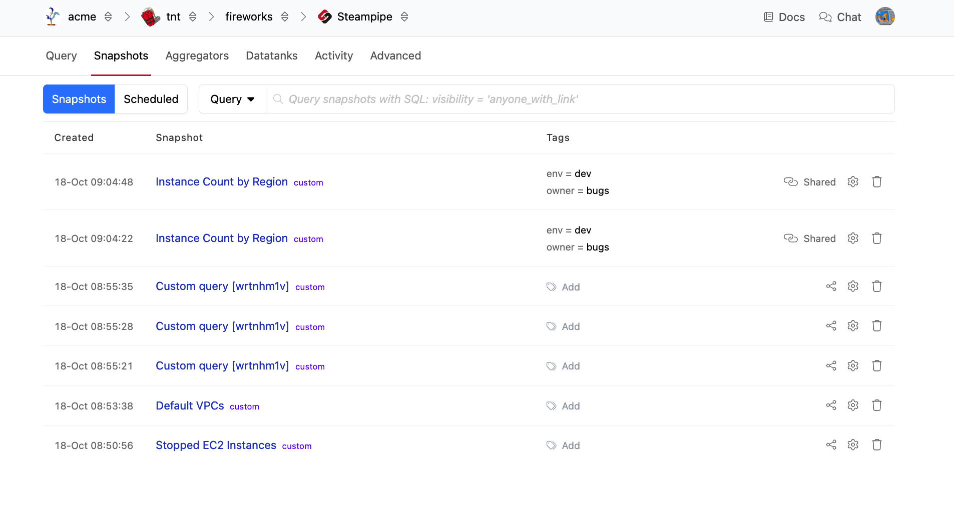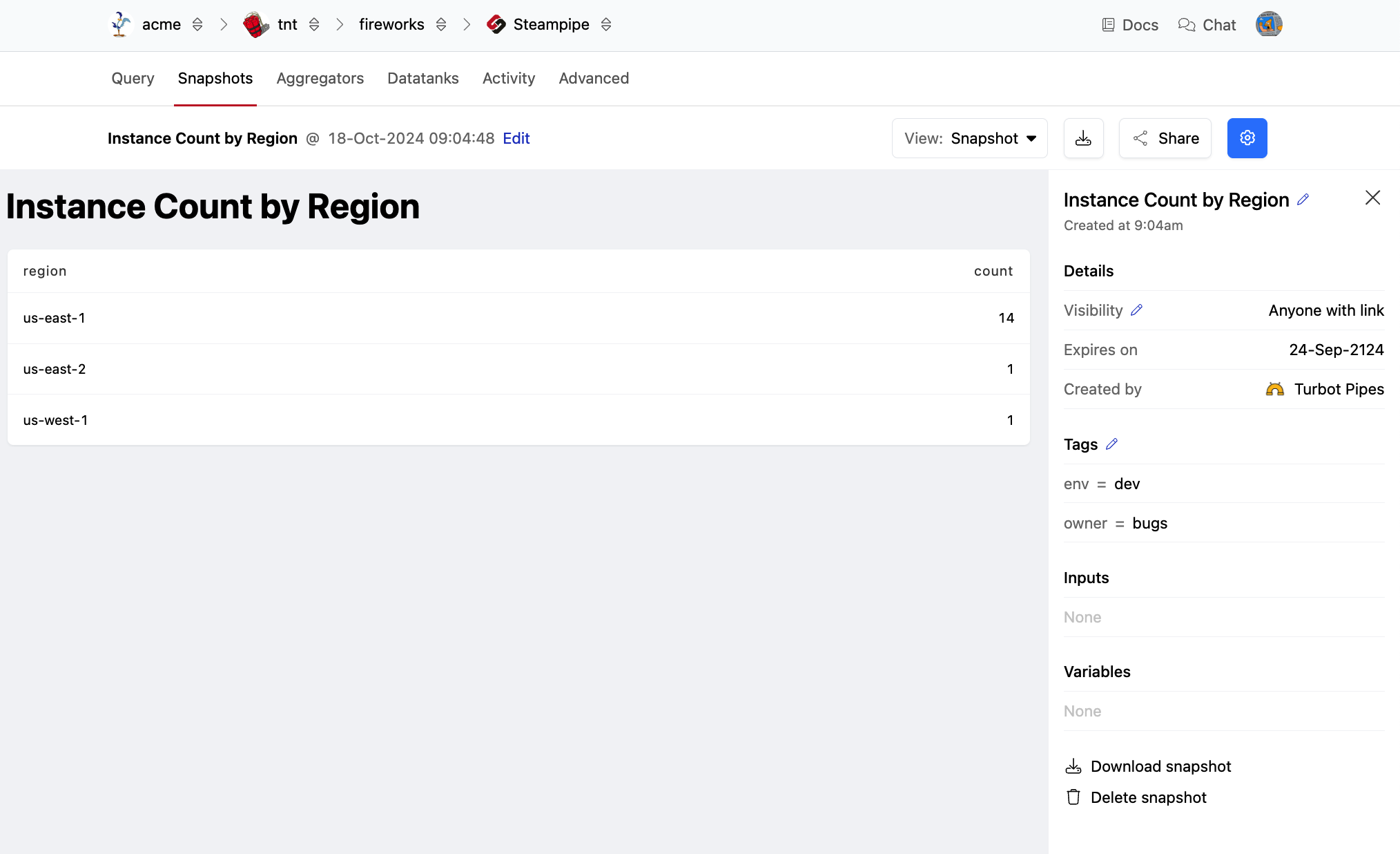 Turbot Pipes allows you to save and share query snapshots that are dashboards containing a table generated from your query results. You can save and schedule query snapshots from the Query tab, or take snapshots from the Steampipe CLI and upload them to your workspace.