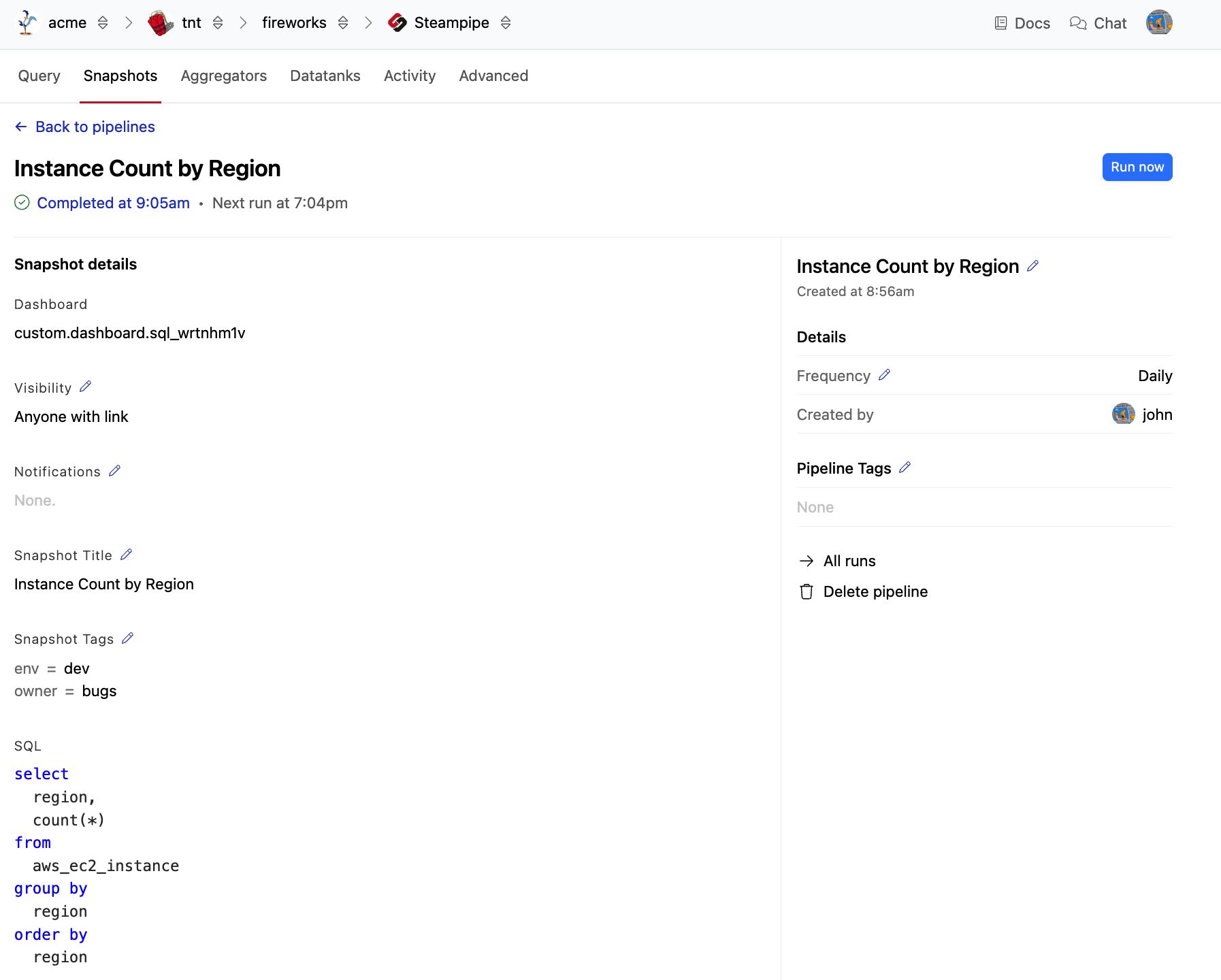 To view a list of snapshots, navigate to your workspace. From the Pipes tab, select Steampipe, then go to the Snapshots tab.