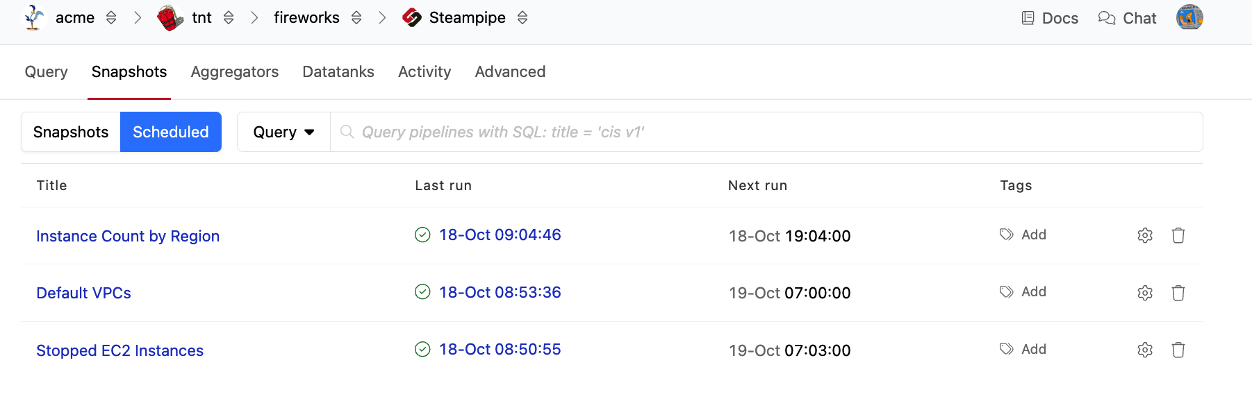 To view a list of snapshot schedules, navigate to your workspace. From the Pipes tab, select Steampipe, then go to the Snapshots tab.