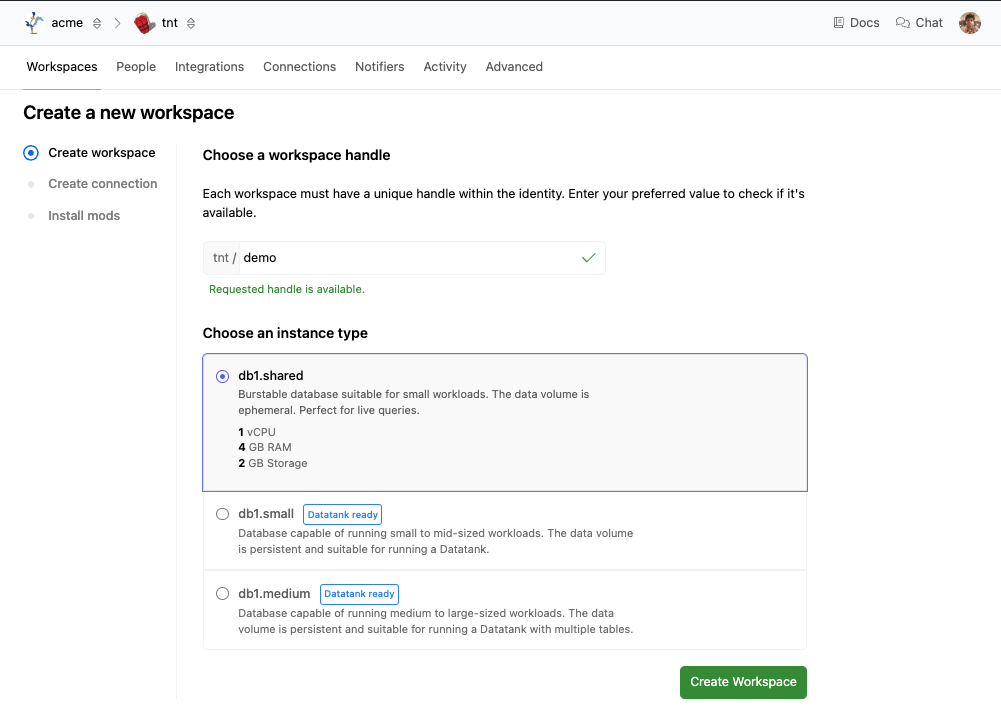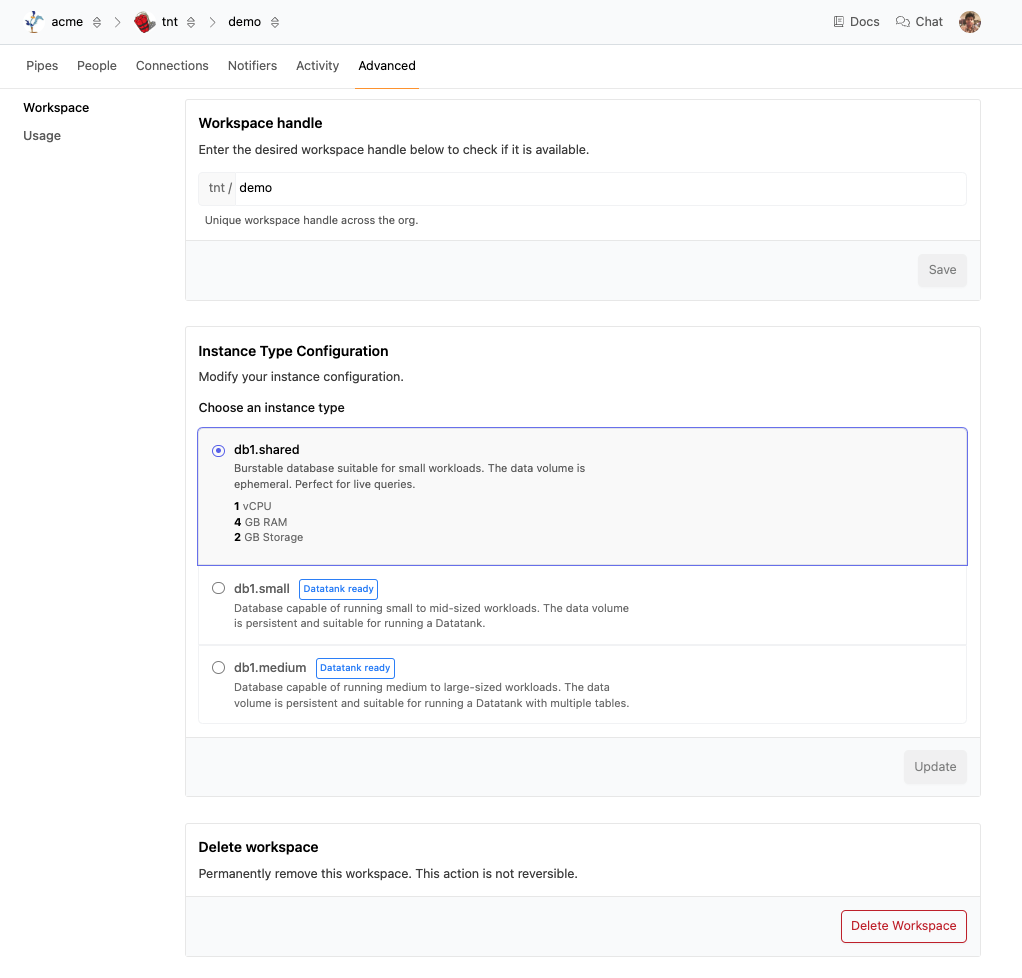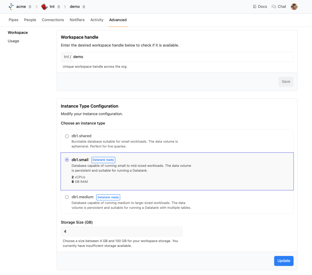 If you are on a paid plan, you may select the instance type for your workspace. Select the instance type that meets your capacity, performance, capability, and cost requirements.
