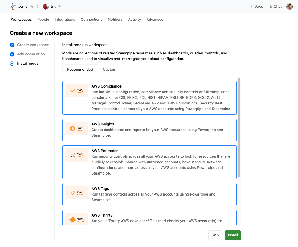 The Workspace is where work gets done! A Workspace provides a secure, independent set of Pipes resources. Workspaces allow you to separate your Steampipe instances for security, operational, or organizational purposes. Your workspace includes: